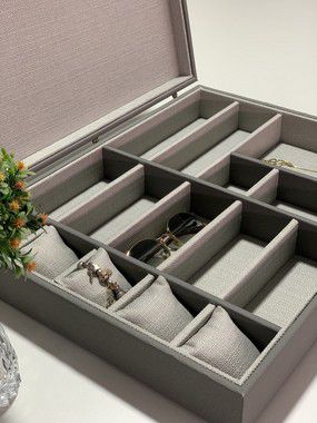 Nela voce pode guardar óculos, relógios,anéis, brincos,pulseiras,colares ou que desejar.